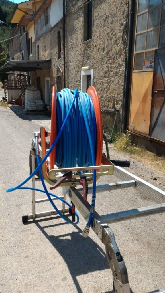 L’estensione del terreno non è elevata, dotando il compressore di varie prolunghe elettriche riesco a portarlo ad una distanza di 100/150 metri dalla presa e, aggiungendo a questa il tubo di 100 metri per l’aria compressa, coprire una buona area.