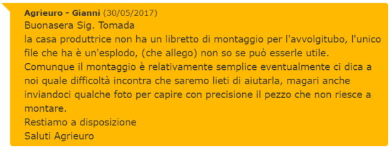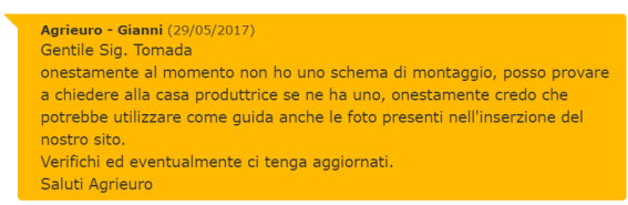 Per fortuna, Agrieuro ha questo sistema di ticket assistenza dove aiutano i loro clienti in difficoltà, di certo non possono fornire un manuale di montaggio, non essendo loro i produttori, ma possono aiutarmi nel montaggio.