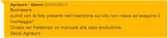 Niente da fare, ci ho provato ma la risposta di Agrieuro non coglie il senso della mia provocazione; non ci sono le istruzioni per il montaggio? Agrieuro si vanta di avere un’assistenza dedicata al cliente anche per il post-vendita? Me lo dimostri realizzando un video per un articolo da montare che non presenta istruzioni.