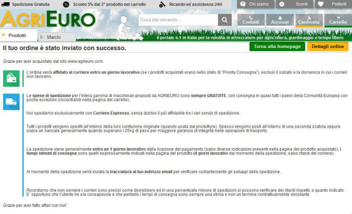 Agrieuro, tramite email delle 08:24, mi fa sapere che l’ordine è stato trasmesso al magazzino per la fase di imballaggio e che verrà inoltrato a breve al corriere.