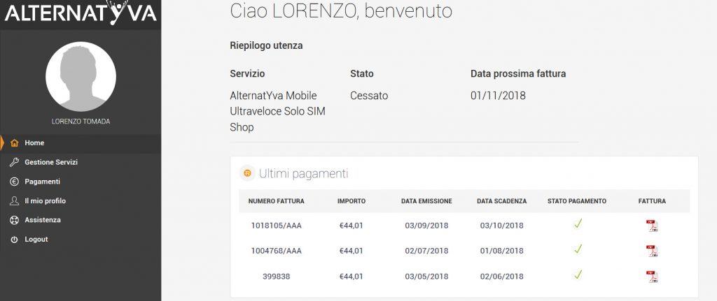 come da lei richiesto, abbiamo dato seguito alla procedura di disdetta dell’utenza AlternatYva Mobile intestata a suo nome.