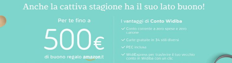 Le promozioni di benvenuto sono ricorrenti per molti istituti di credito, Widiba utilizza normalmente il canale Amazon per incentivare gli utenti a iscriversi e diventare loro correntisti.