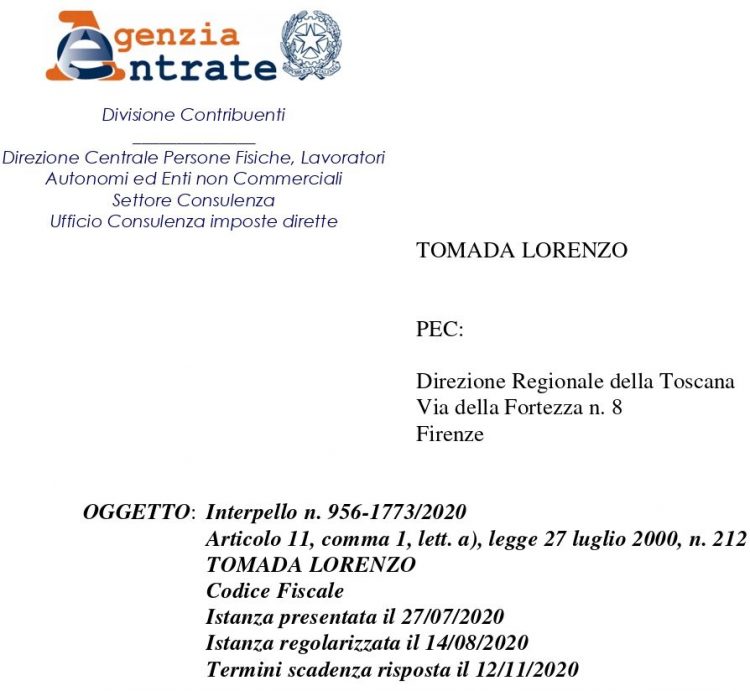 non so se l’ADE l’ha già pubblicato e se è tenuta a farlo, il mio è l’interpello ordinario N. 956-1773/2020.