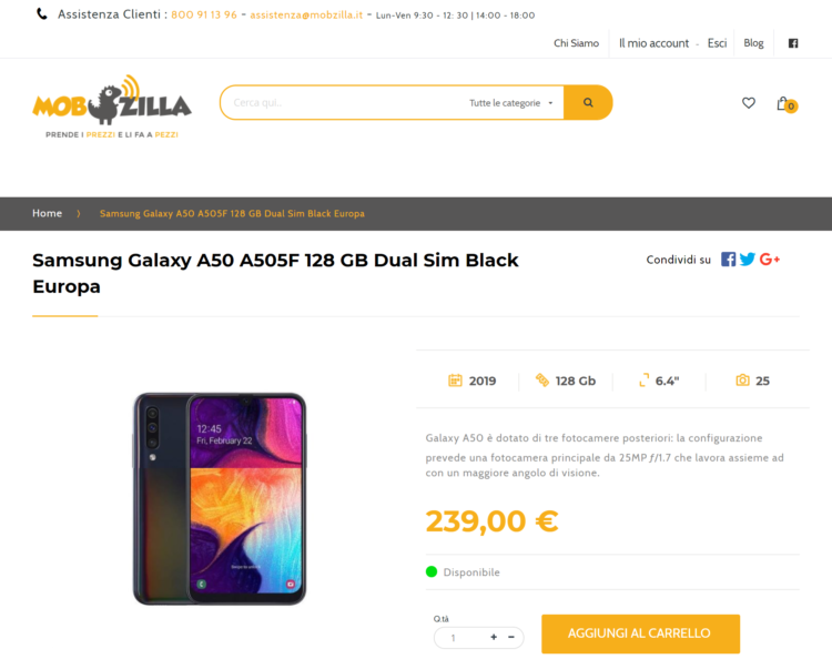 Oggi desidero testare Mobzilla, un ecommerce specializzato principalmente nella telefonia con la vendita di smartphone, tablet, smartwatch e accessori. L’occasione è l’acquisto del nuovo medio di gamma Samsung A50 proposto a €239,00, più €9,90 di spese di spedizione assicurata.
