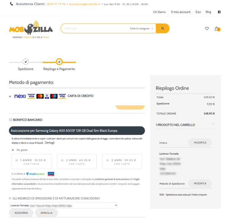 alla scelta del metodo di pagamento e dell’eventuale assicurazione del prodotto in collaborazione con Simple Insurance (da me scartata)