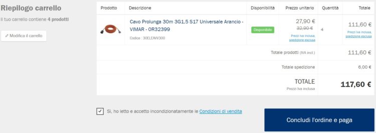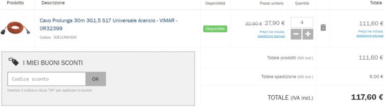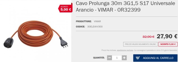 Oggi voglio testare Mollo Store, un e-commerce che ho trovato su Google alla ricerca del miglior prezzo e disponibilità per l’acquisto di 4 prolunghe Vimar 0R32399 con, ognuna, un cavo lineare di 30 metri, una spina 2P+T 16 A 250 V~ standard italiano tipo S17 e una presa SICURY 2P+T 16 A 250 V~ universale standard italiano tipo P40.