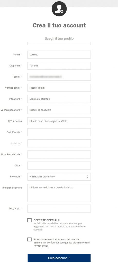 Inserisco tutti i dati richiesti e, tra questi, una password per poter seguire questo ordine e lo storico di tutti gli ordini nell’area riservata.