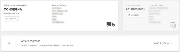 Dopo aver confermato gli indirizzi di fatturazione e spedizione, per me differenti tra loro,