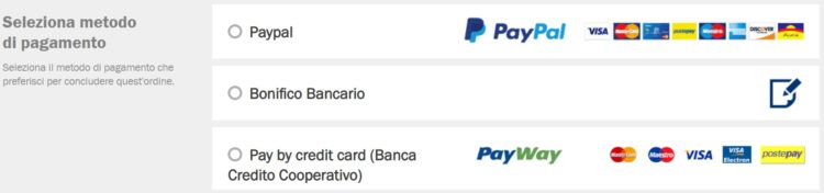 scelgo la modalità di pagamento tra Paypal, bonifico bancario e carte di credito (è possibile pagare la merce in contrassegno)