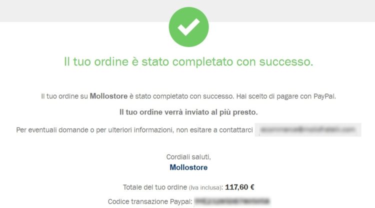 Dopo aver effettuato il pagamento con Paypal ricevo conferma del buon esito dell’acquisto.