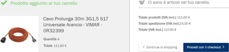 Dopo aver parlato con l’assistenza, e convinto dalle risposte ricevute, decido di procedere all’acquisto delle prolunghe Vimar 0R32399 selezionando le unità desiderate (4) e aggiungendole al carrello.