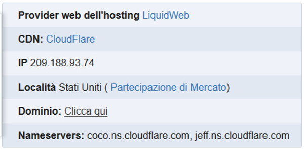 Nello specifico prendiamo come esempio il mio sito http://www.lorenzotomada.it, molti dei servizi di ricerca consultati riportano erroneamente che il mio blog è sul server di Cloudflare, informazione esatta ma non esaustiva in quanto Cloudflare mi fornisce alcuni servizi specifici per la ridistribuzione dei contenuti ma l’hosting provider è in realtà, al momento della pubblicazione di questo post, Liquidweb.