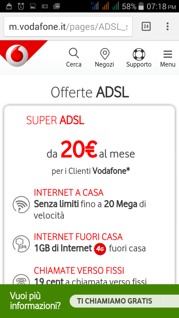 La pagina che avrebbe dovuto salvare le mie finanze non è altro che una pubblicità di Vodafone con un’offerta ADSL a partire da 20 euro