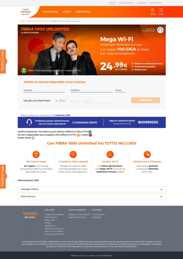 Il primo step è l’inserimento dell’indirizzo nel quale si desidera attivare la fibra di Wind, oltre ad essere inclusi nei comuni già serviti da Wind tramite Open Fiber è necessario che il civico sia predisposto