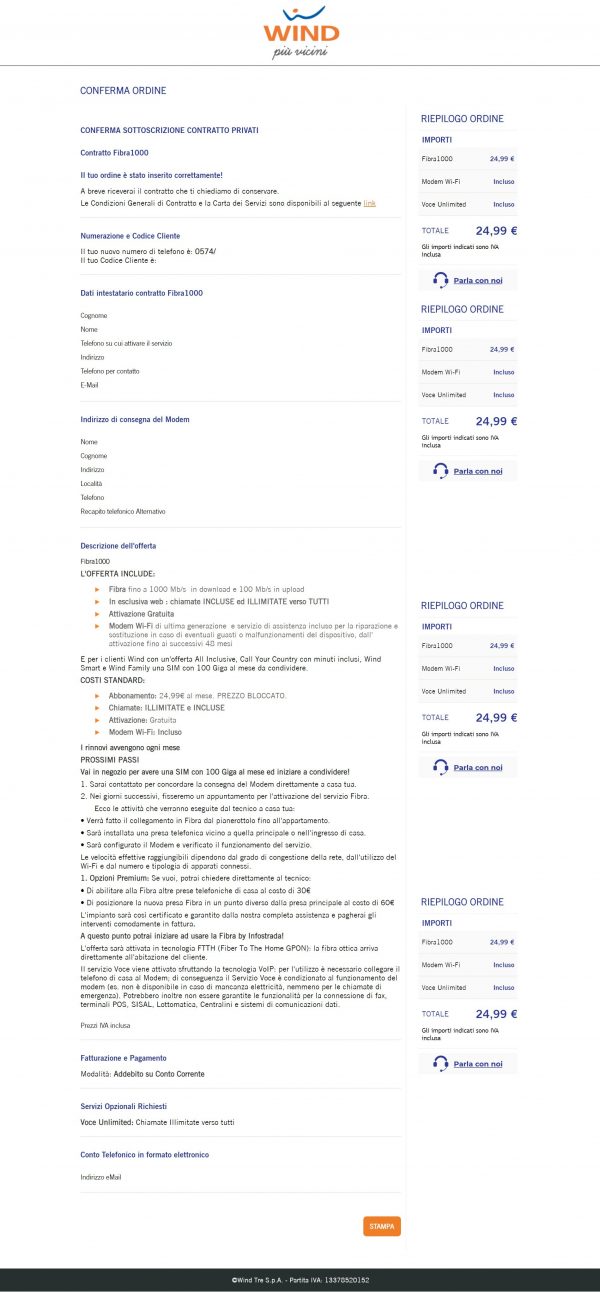 Completati i passaggi necessari l’attivazione viene finalizzata con il riepilogo dei dati: