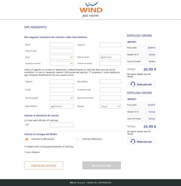 Procedendo è necessario inserire i dati anagrafici dell’intestatario del contratto e della linea telefonica e l’indirizzo di consegna gratuita del modem