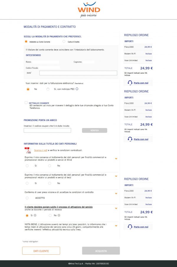 Selezionare la tipologia di pagamento tra l’addebito sul conto corrente e la carta di credito e acconsentire, spuntando le relative caselle, al trattamento dei dati personali, confermare di aver preso visione e di accettare le condizioni del contratto e ad avviare subito il processo di attivazione del servizio.