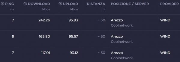 Ho effettuato 3 test, nella stessa giornata, dal notebook Asus connesso in Wi-fi con il router in un corridoio a 6 metri di distanza con una parete che si frappone tra i terminali