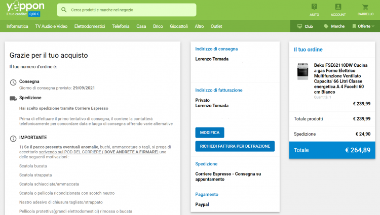 Avendo precedentemente effettuato la creazione del mio account personale, step che quindi non mi viene richiesto in fase di acquisto, e non avendo interesse ad aggiungere i servizi opzionali come la consegna al piano e all’estensione della garanzia di ulteriori 3 anni oltre a quella di legge, procedo a finalizzare l’ordine e a saldare tramite Paypal.