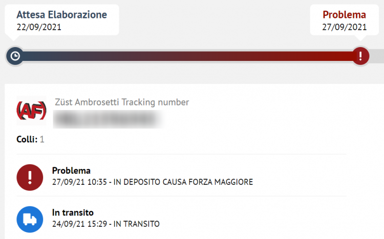 Venerdì 24 settembre l’ordine passa allo stato “In transito” e Züst Ambrosetti si sta avvicinando verso la consegna finale della mia spedizione.