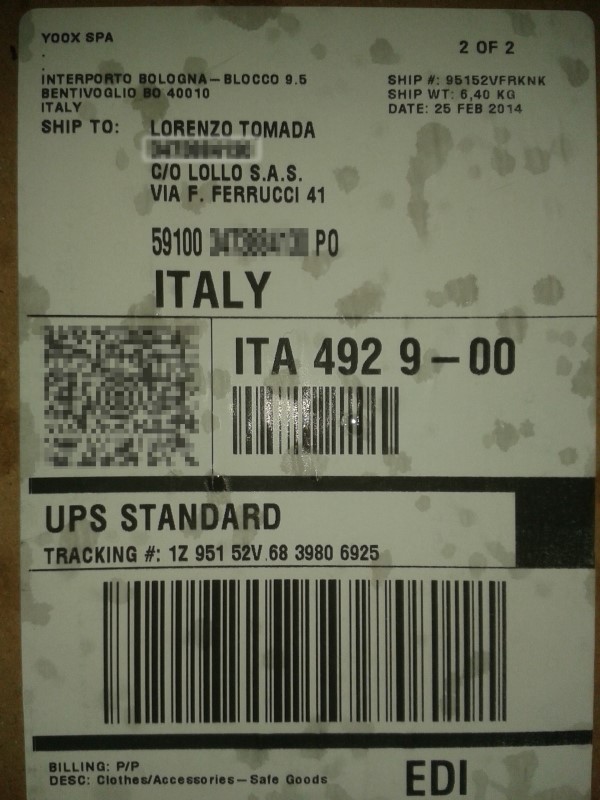 Tra i magazzini di Yoox a Bologna e l’indirizzo di consegna a Prato ci sono meno di 100 km (98,7 per la precisione) ma ricevere la merce in un solo giorno lavorativo rafforza, fino a questo momento, l’opinione positiva sull’esperienza d’acquisto.